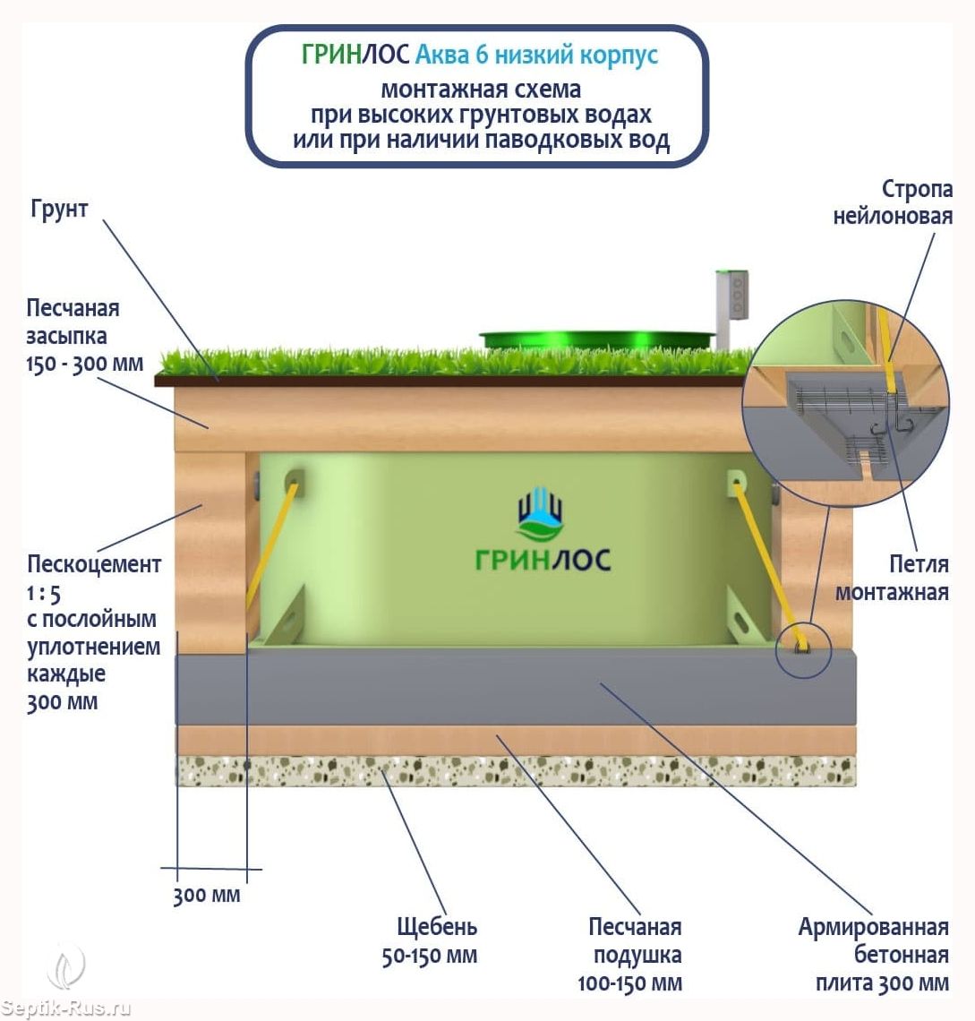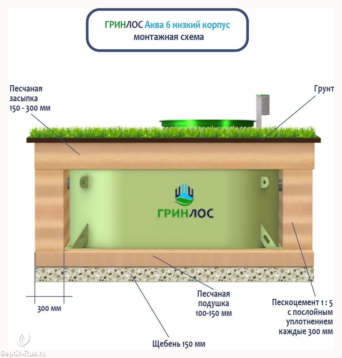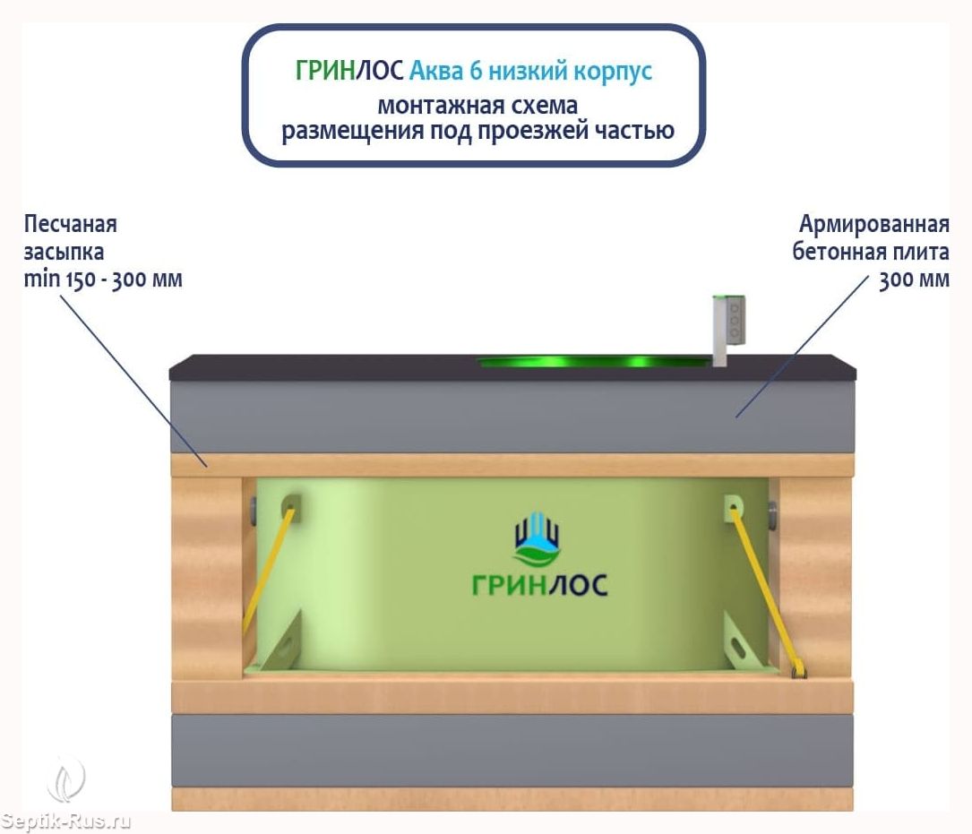 Перед непосредственным монтажом ГРИНЛОС Аква 6 низкий корпус специалисты осуществляют подготовку котлована. Его размеры определяются конструктивными особенностями выбранной модели оборудования.