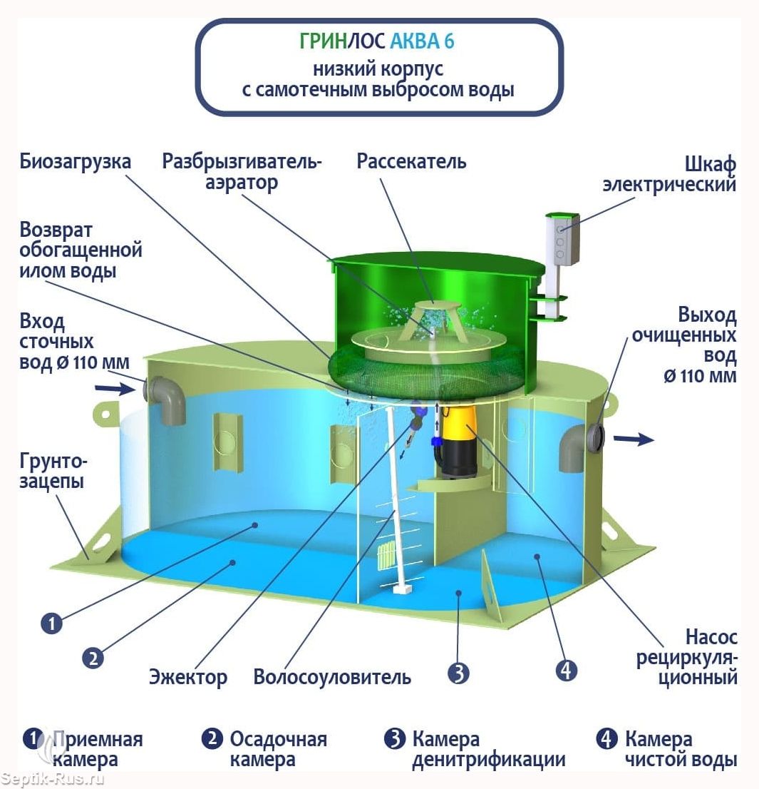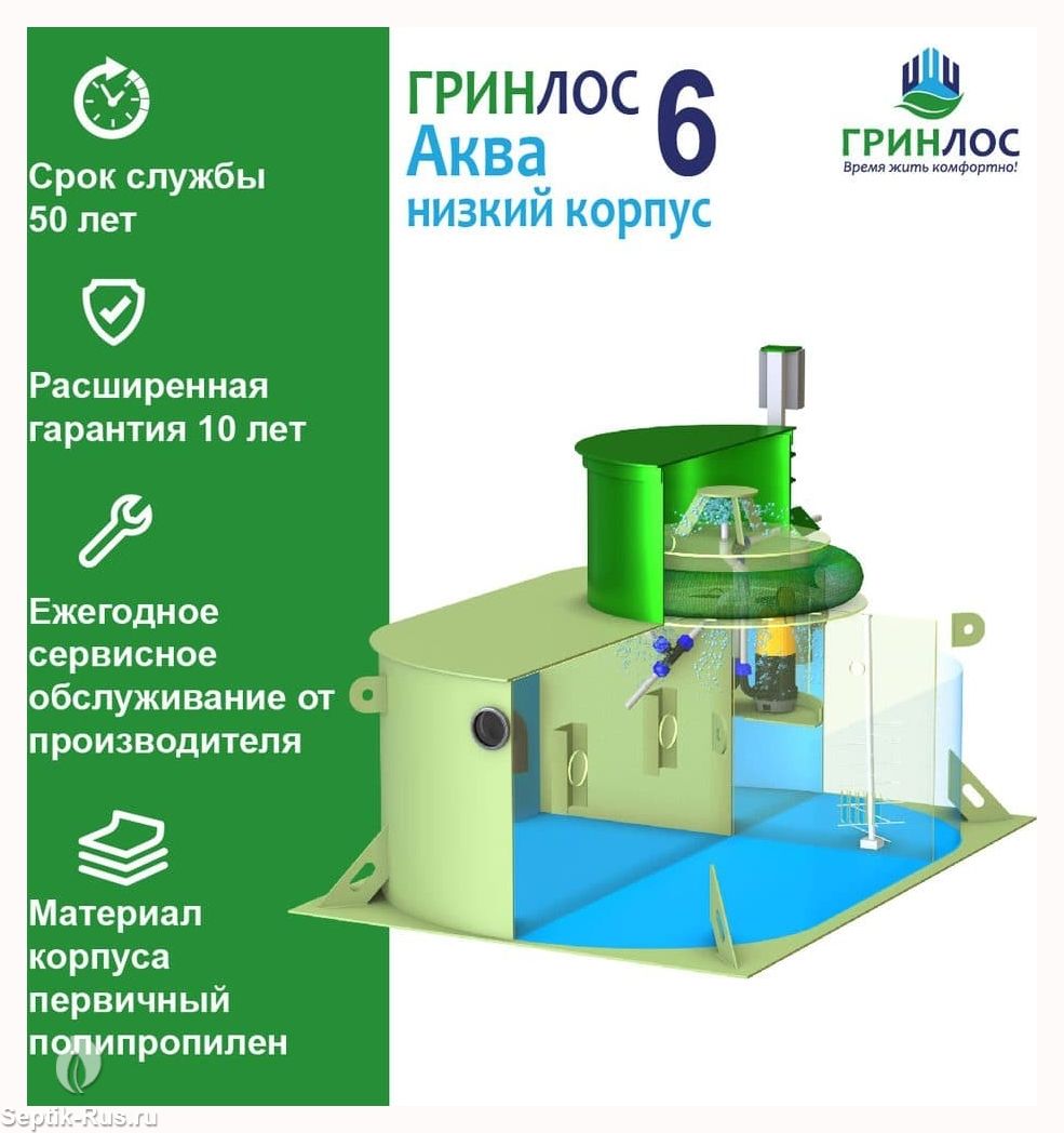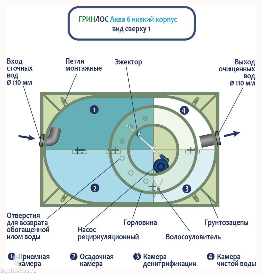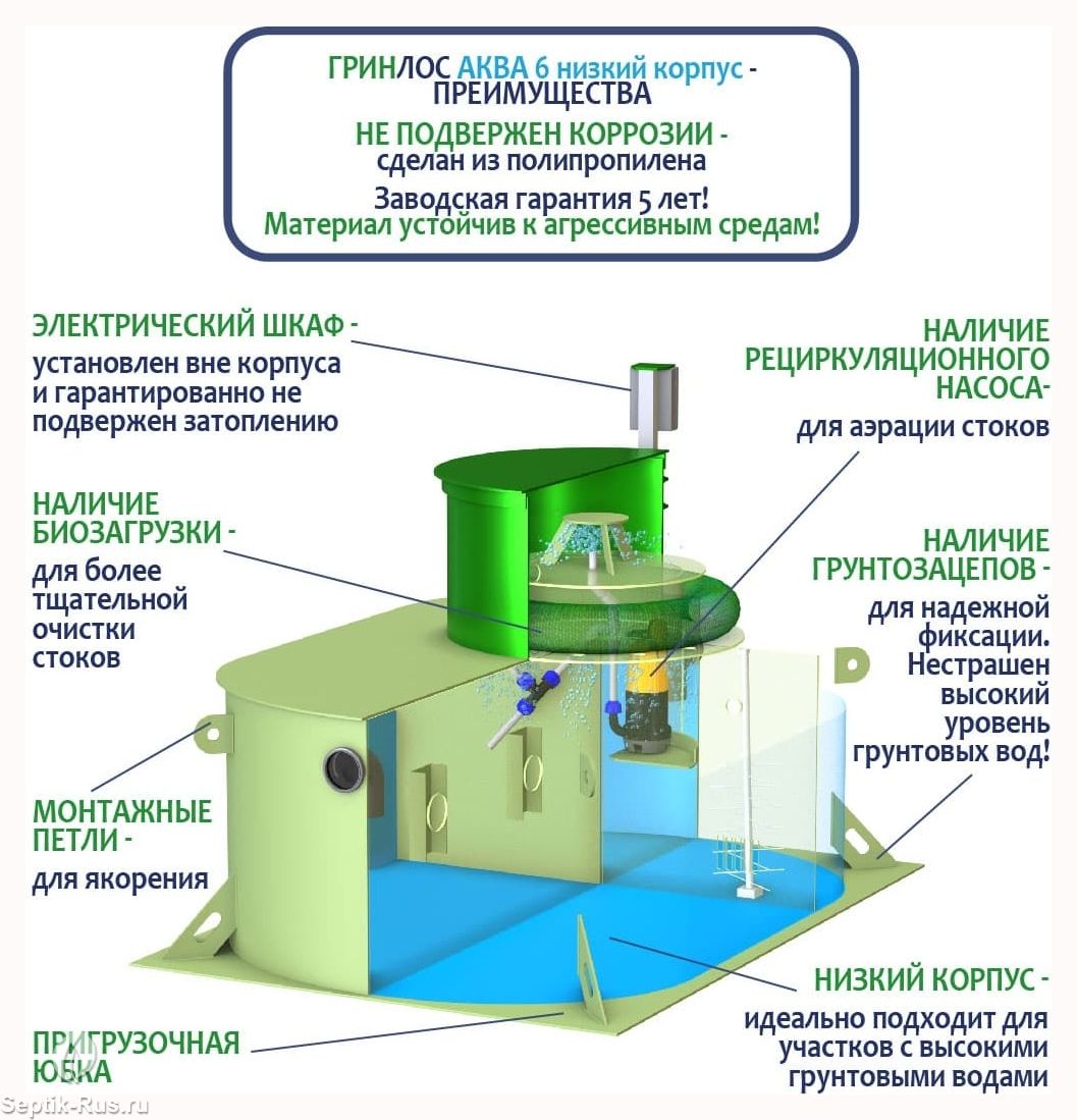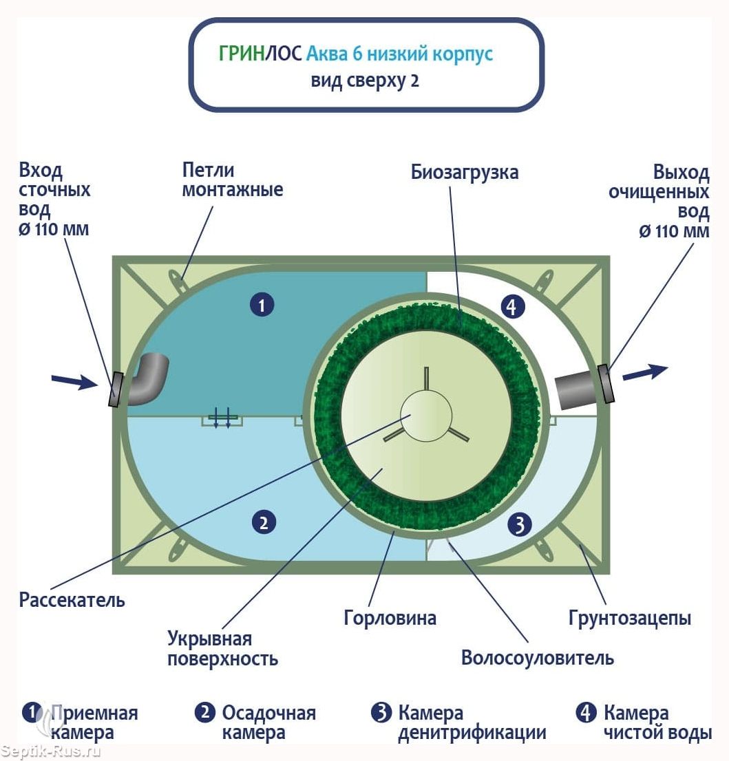 ГРИНЛОС Аква 6 низкий корпус изготавливаются из полипропилена чешского производства. Нижний уровень разделен на четыре отсека со специальными технологическими переливами. Перетекая из одного отстойника в другой, стоки проходят первоначальный процесс отстаивания, усреднения стоков, отделения нерастворимых фракций (жиров и т.д.), которые остаются в первом отсеке. При этом уже в первом отсеке начинается очистка стоков свободным активным илом. Затем, из третьего отсека, стоки посредством дренажного насоса подаются на верхний уровень, на специальный разбрызгиватель, через который происходит орошение биофильтра.