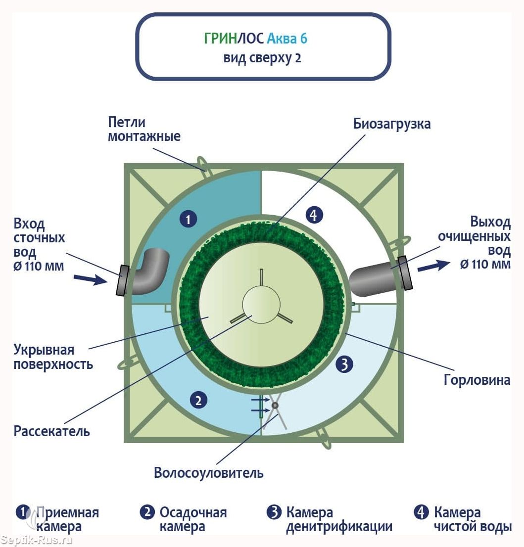 ГРИНЛОС Аква 6 изготавливаются из полипропилена чешского производства. Нижний уровень разделен на четыре отсека со специальными технологическими переливами. Перетекая из одного отстойника в другой, стоки проходят первоначальный процесс отстаивания, усреднения стоков, отделения нерастворимых фракций (жиров и т.д.), которые остаются в первом отсеке. При этом уже в первом отсеке начинается очистка стоков свободным активным илом. Затем, из третьего отсека, стоки посредством дренажного насоса подаются на верхний уровень, на специальный разбрызгиватель, через который происходит орошение биофильтра.
