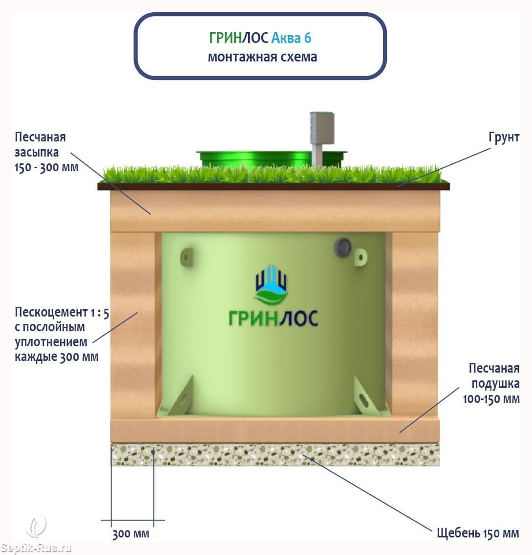 Перед непосредственным монтажом ГРИНЛОС Аква 6 специалисты осуществляют подготовку котлована. Его размеры определяются конструктивными особенностями выбранной модели оборудования.